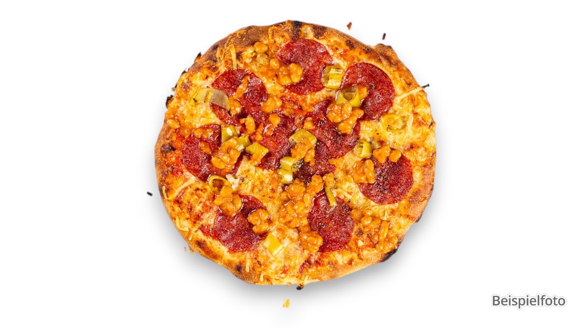 mit Hackfleisch, Salami, Peperoni und Hot-Chili-Öl
