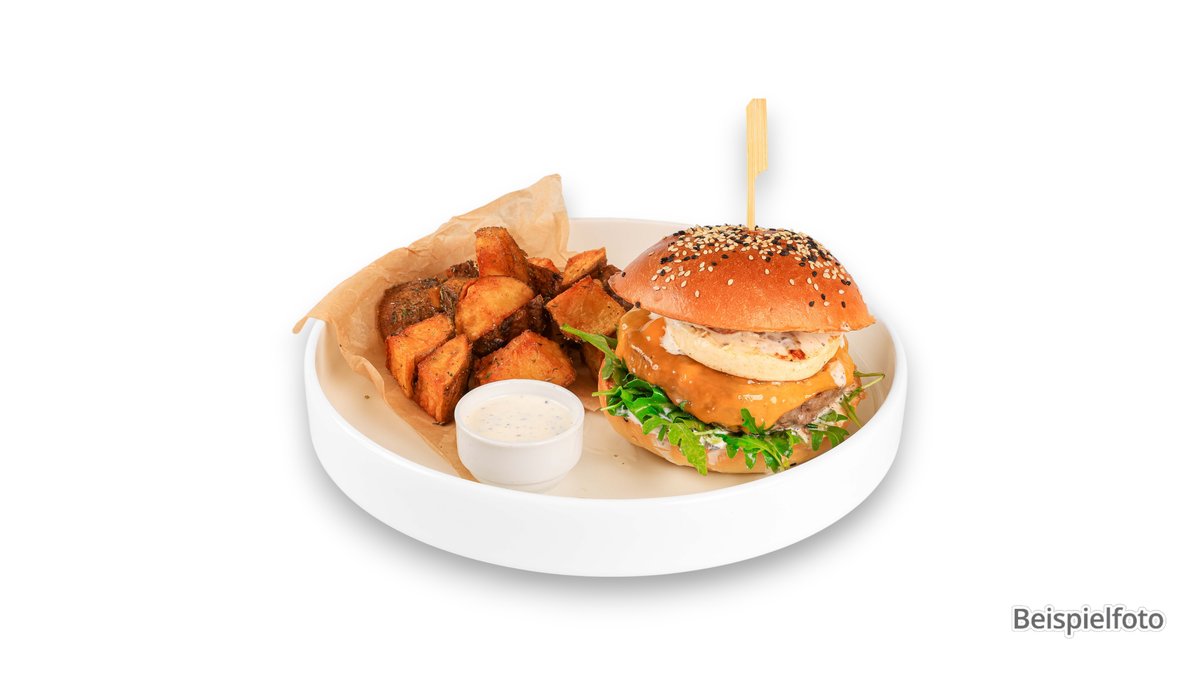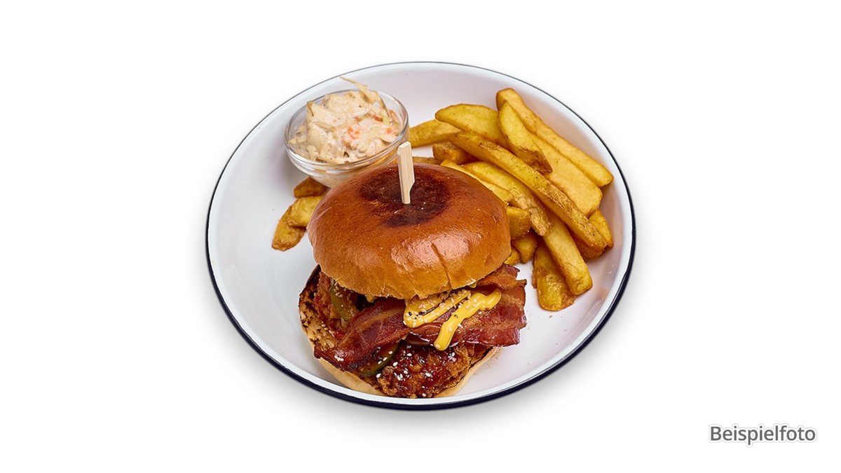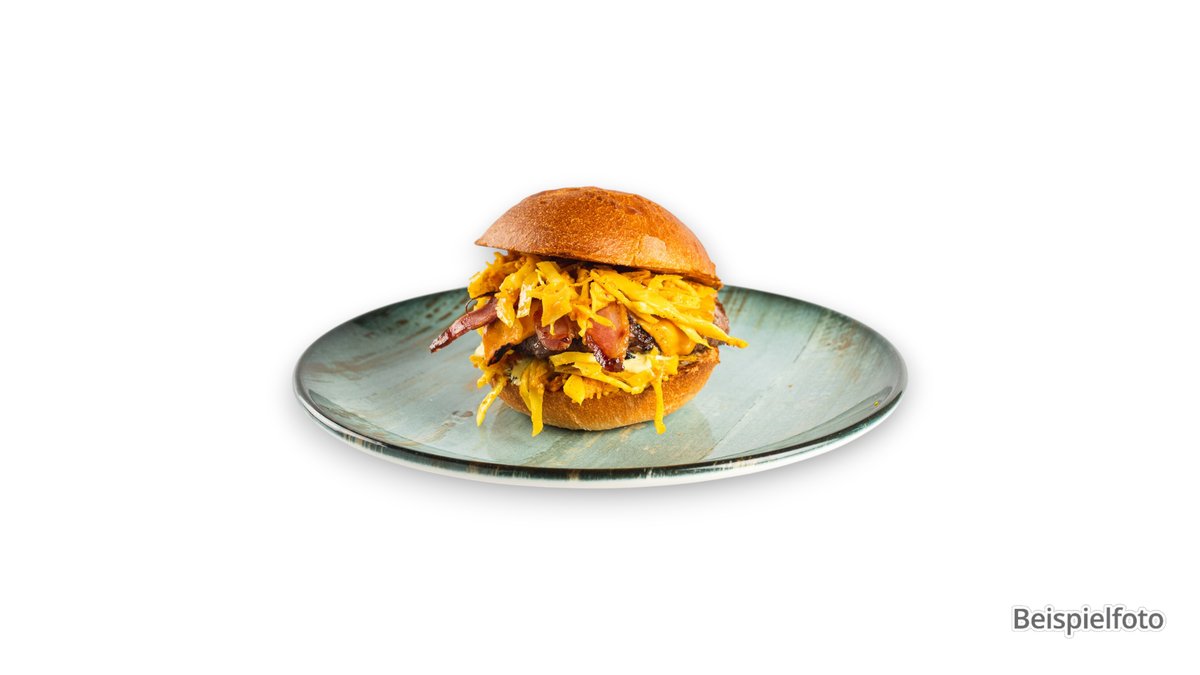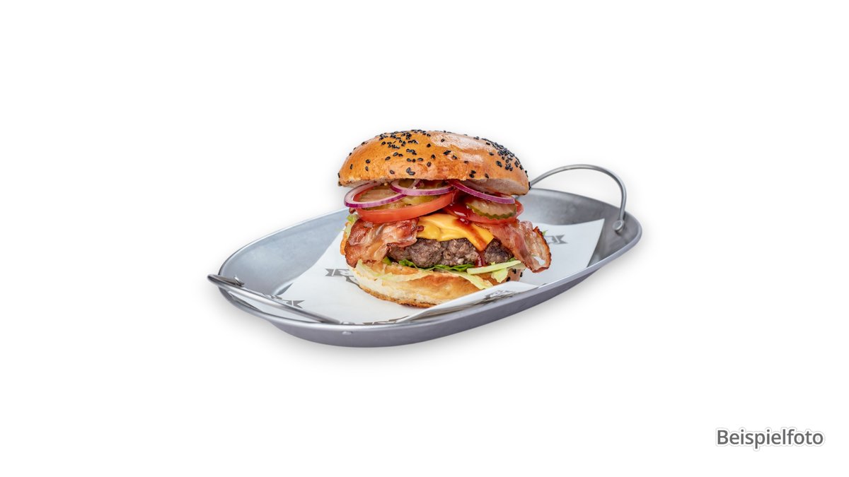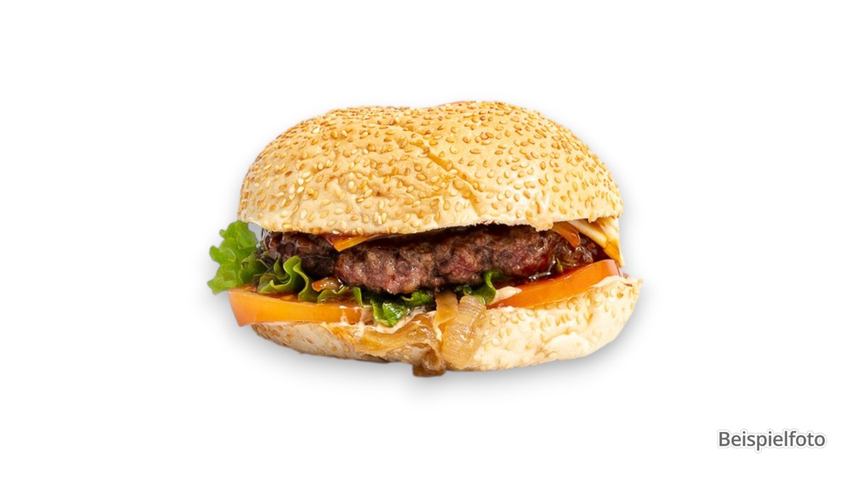 mit Americansoße, Zwiebeln, Gurken, Peperoni, Paprika, Tomaten, Salat, Speck und Rindfleisch