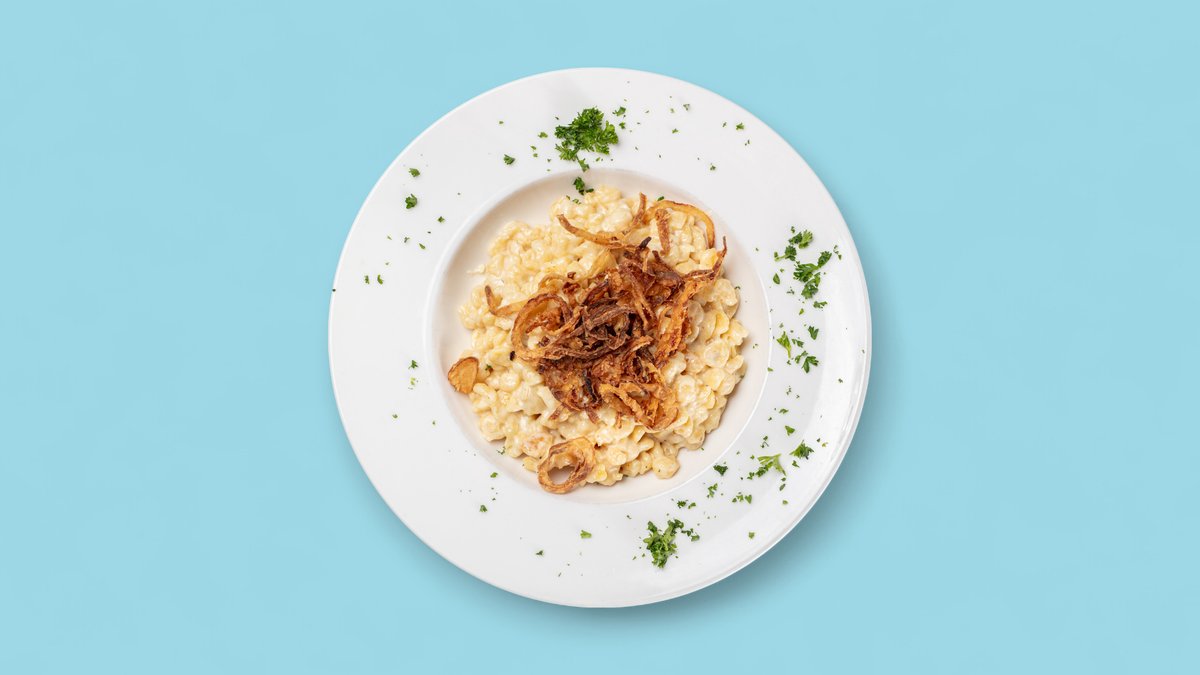 mit Käsespätzle und hausgemachten Röstzwiebeln