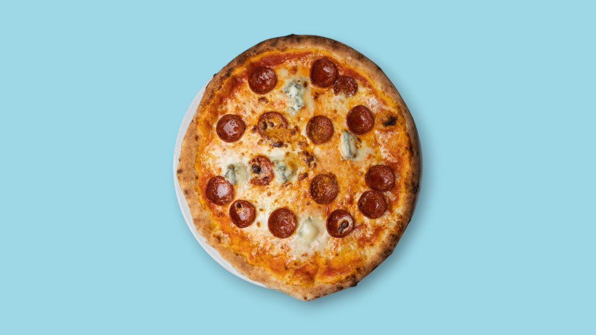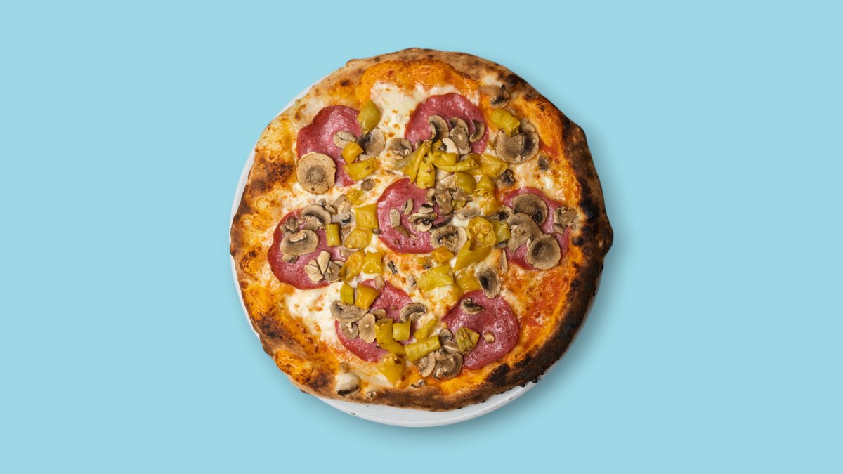 mit Vorderschinken (Schwein), Champignons, Salami (Schwein) und Peperoni