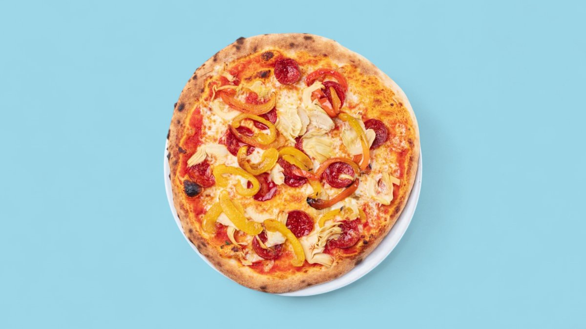 mit Vorderschinken (Schwein), Salami (Schwein), Artischocken und Peperoni
