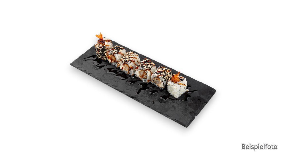 4x Maki gekochter Thunfisch 4x Maki Gurken 8x Uramaki frittierte Garnelen, Avocado, Mayonnaise und Sesam 8x Uramaki Krebsfleisch, Avocado, Frischkäse. Fischroggen und Sesam