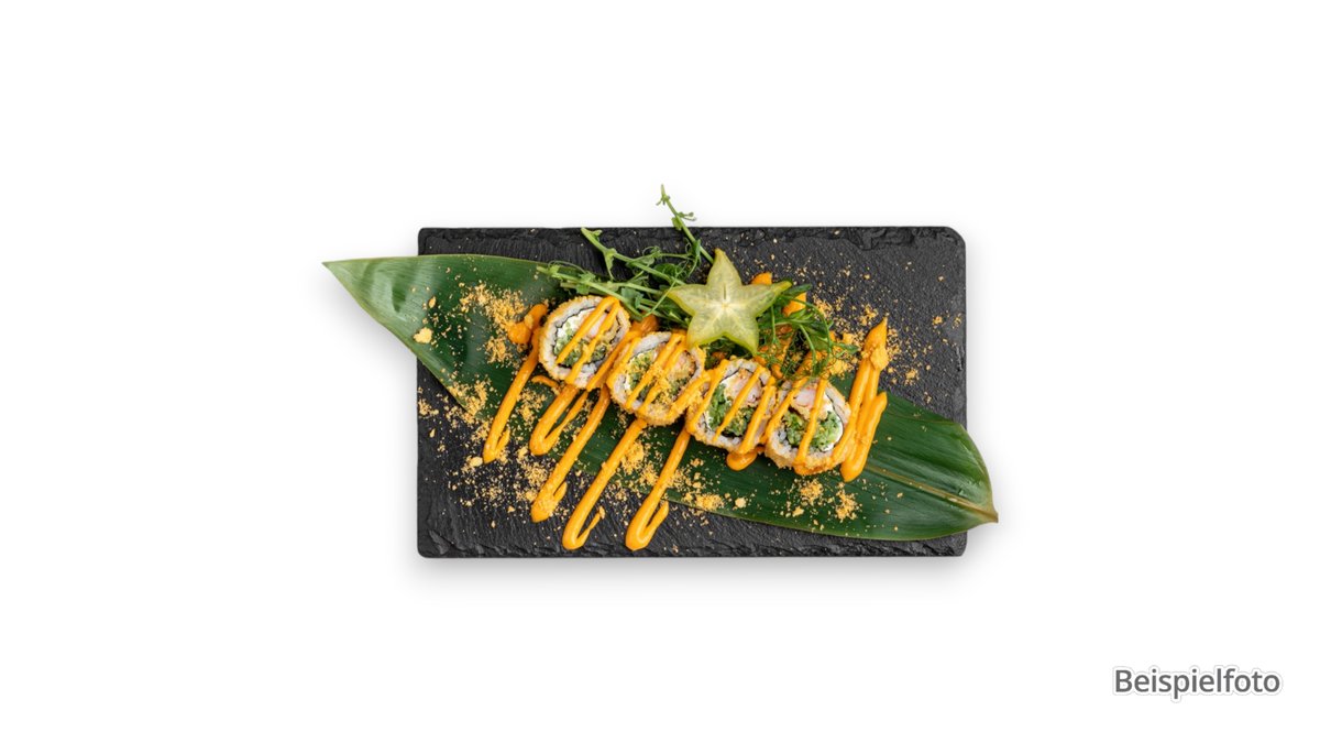 4x Maki Avocado 4x Maki Lachs 8x Uramaki Lachs, Avocado, Fischroggen und Frischkäse 8x Spezial Uramaki Lachs, Avocado Tempura, pikante Mayo, bedeckt mit Lachs