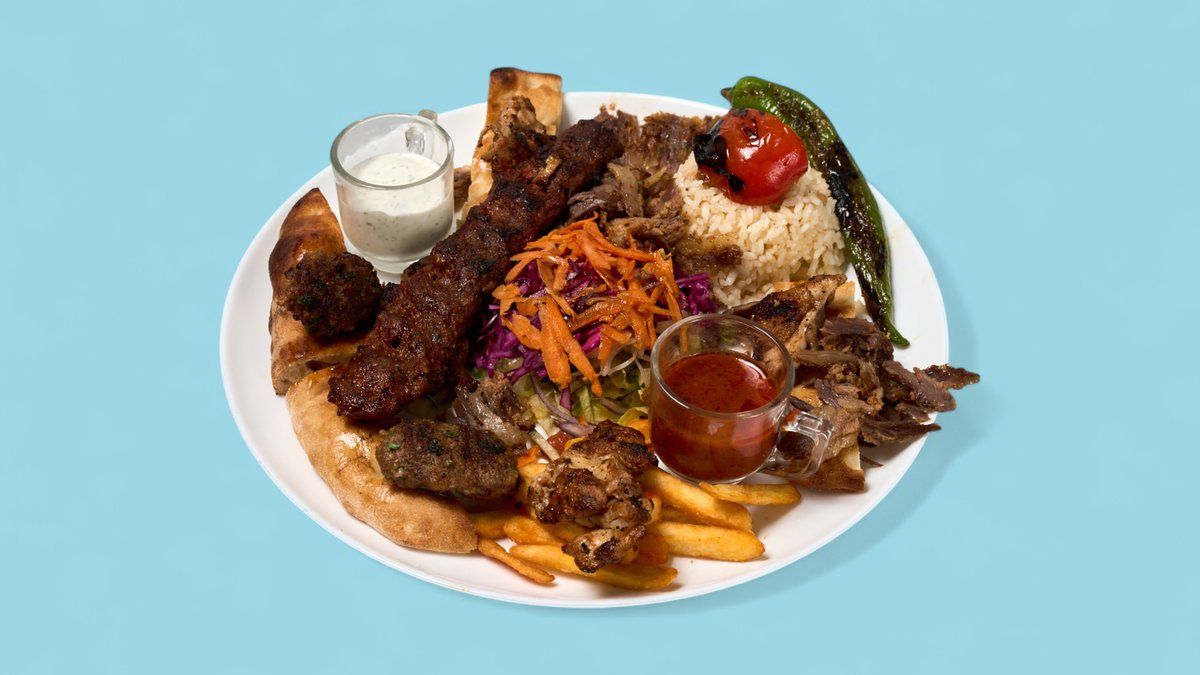 2x Köfte 1x Adana 1x Hähnchenspieß und Döner mit Salat, Brot und einer Beilage deiner Wahl
