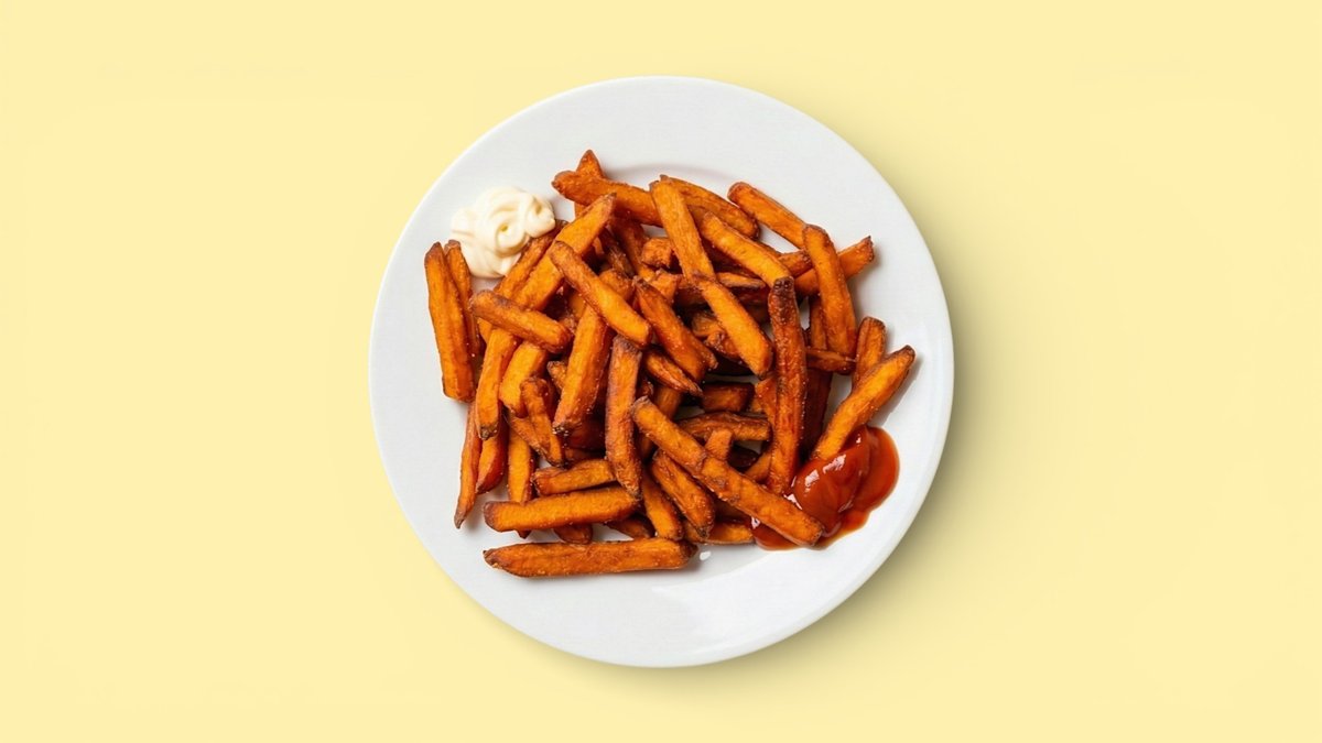 mit Pommes frites, Salzgurken, Tomaten, Knoblauchcreme im Wrapteig und Ketchup