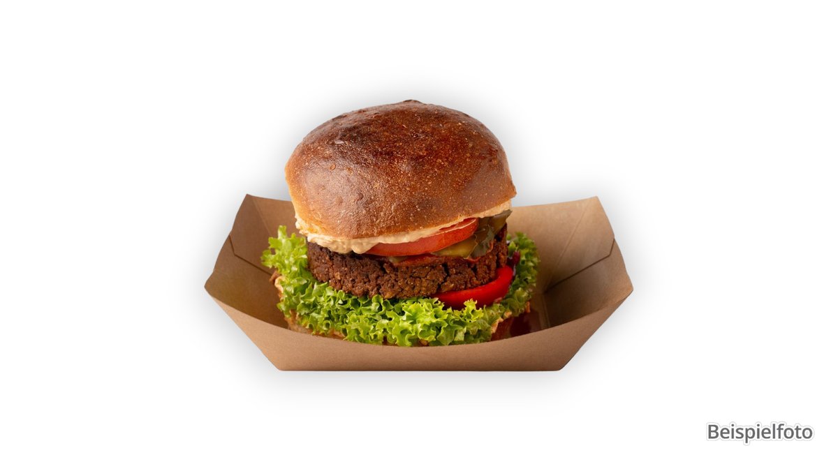 mit vegetarischer Burger-Patty, Tomaten, Salat, Zwiebeln, Salzgurken und AiolisoĂźe