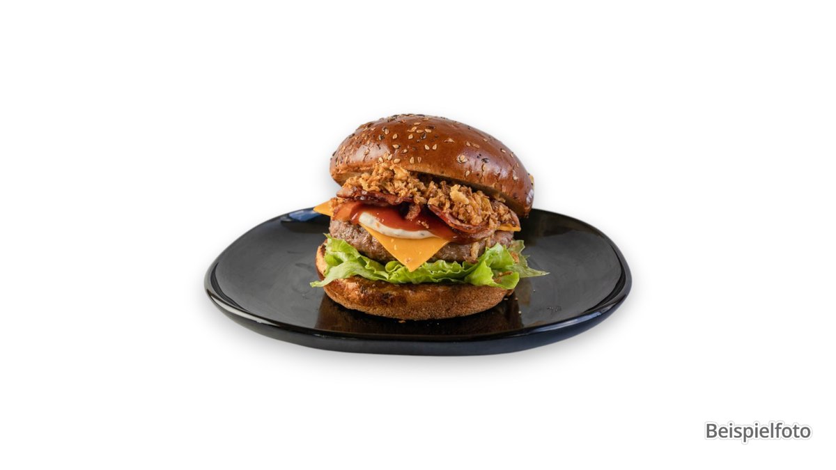 mit 2x Speck, Käse, Rindfleichpatty, Tomaten, Salat, Zwiebeln, Salzgurken und Burgersoße