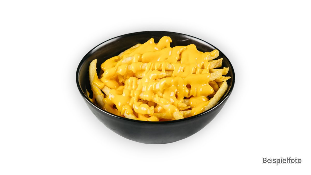 mit Käsesoße, Chili, Pommes frites und Drehspieß vom Hähnchen
