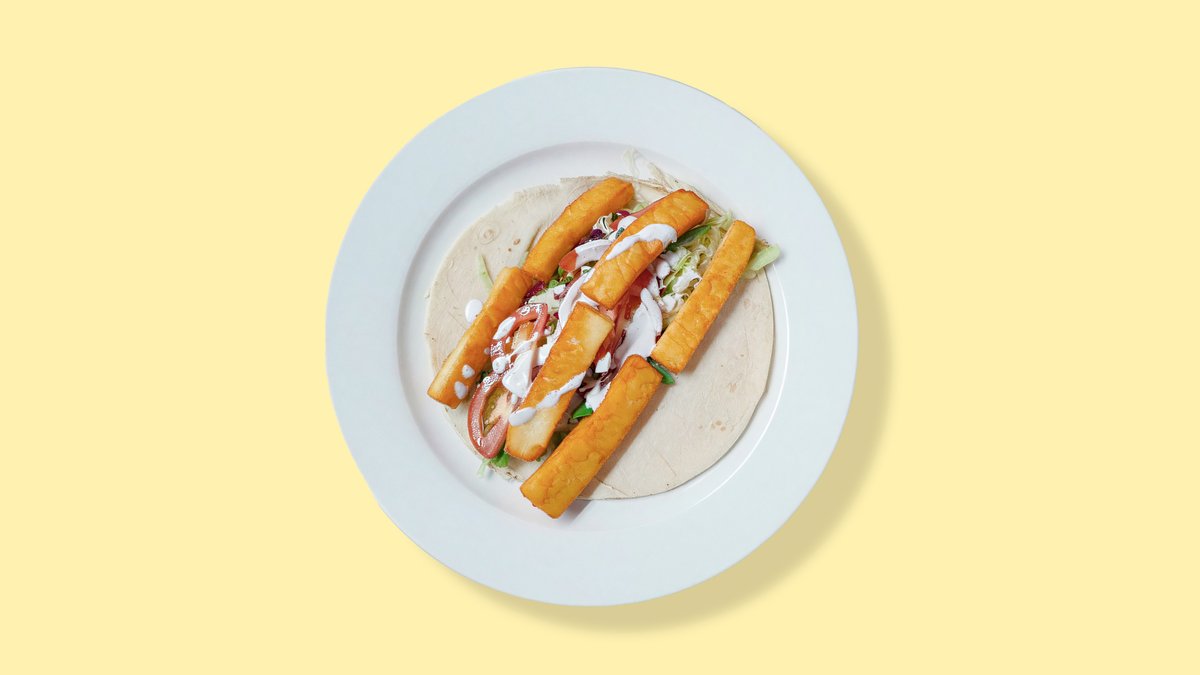 gegrillter Halloumi im Wrapteig mit gebratenem GemĂĽse und SoĂźe