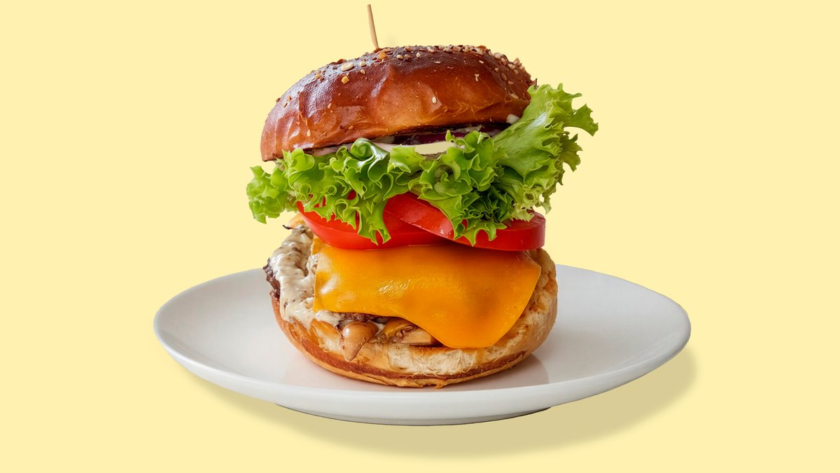 mit Rindfleischpatty, gegrillten Champignons, Tomaten, Salat, Zwiebeln, Käse, Salzgurken und Barbecuesoße