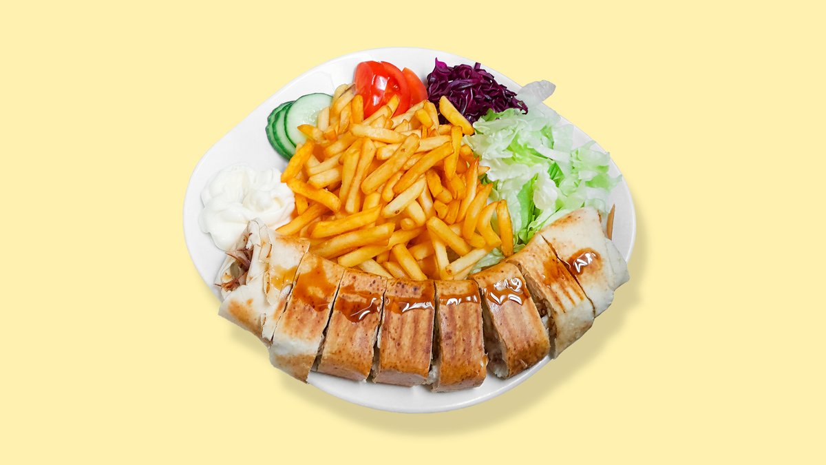 Dönerfieisch mit Pommes frites, Salat und Soße