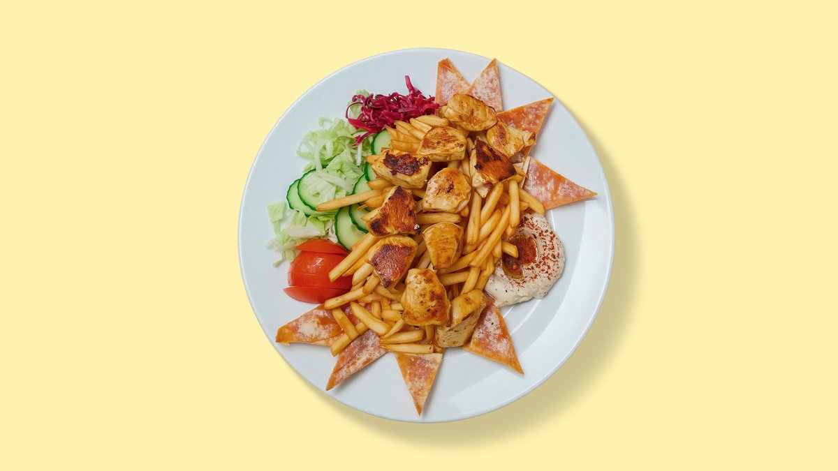 zwei gegrillte Hähnchenbrustspieße mit Pommes frites, Gemüse, Knoblauchcreme, Hummus und scharfem Brot