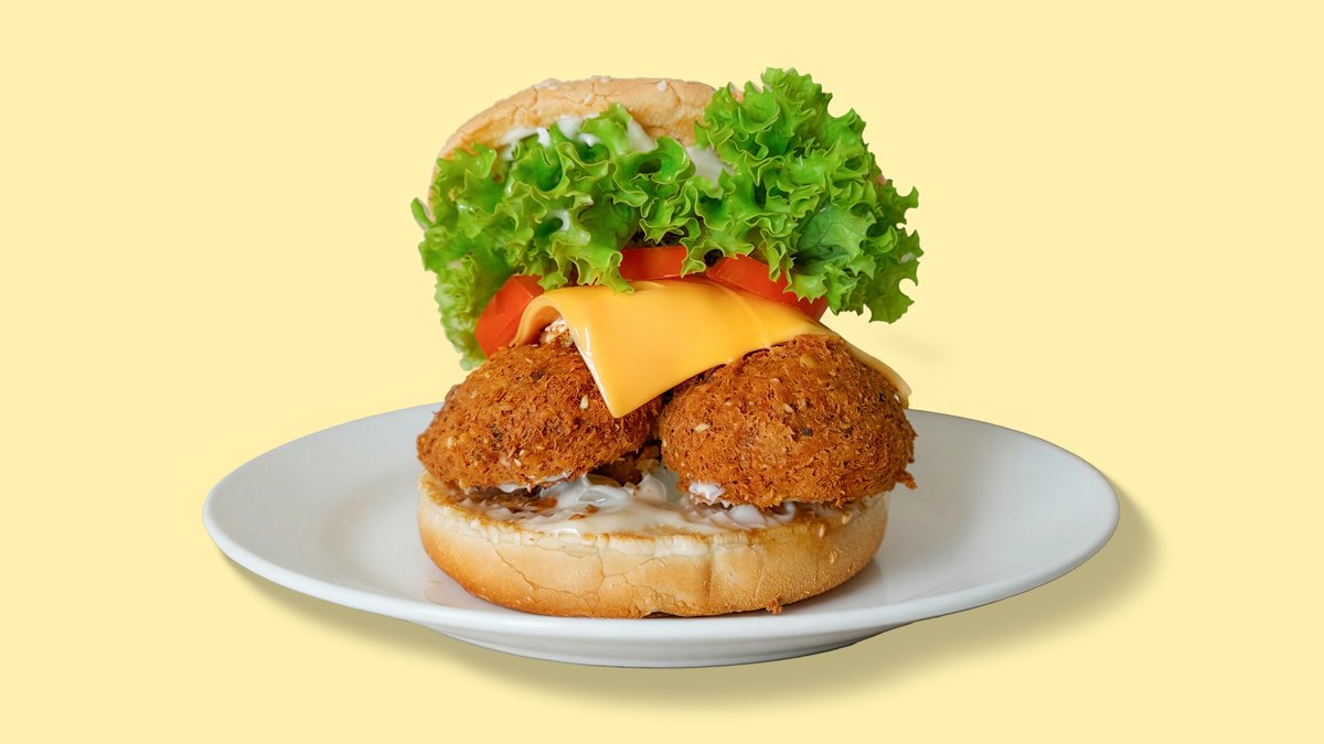 mit paniertem Hähnchenfleischpatty, Tomaten, Salat, Zwiebeln, Salzgurken und Burgersoße