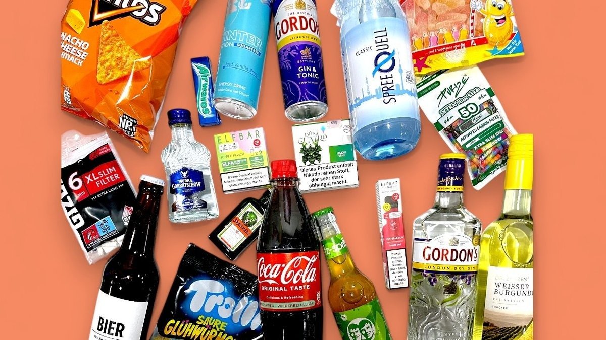 Spätkauf mit vielen verschiedenen Snacks und Getränken