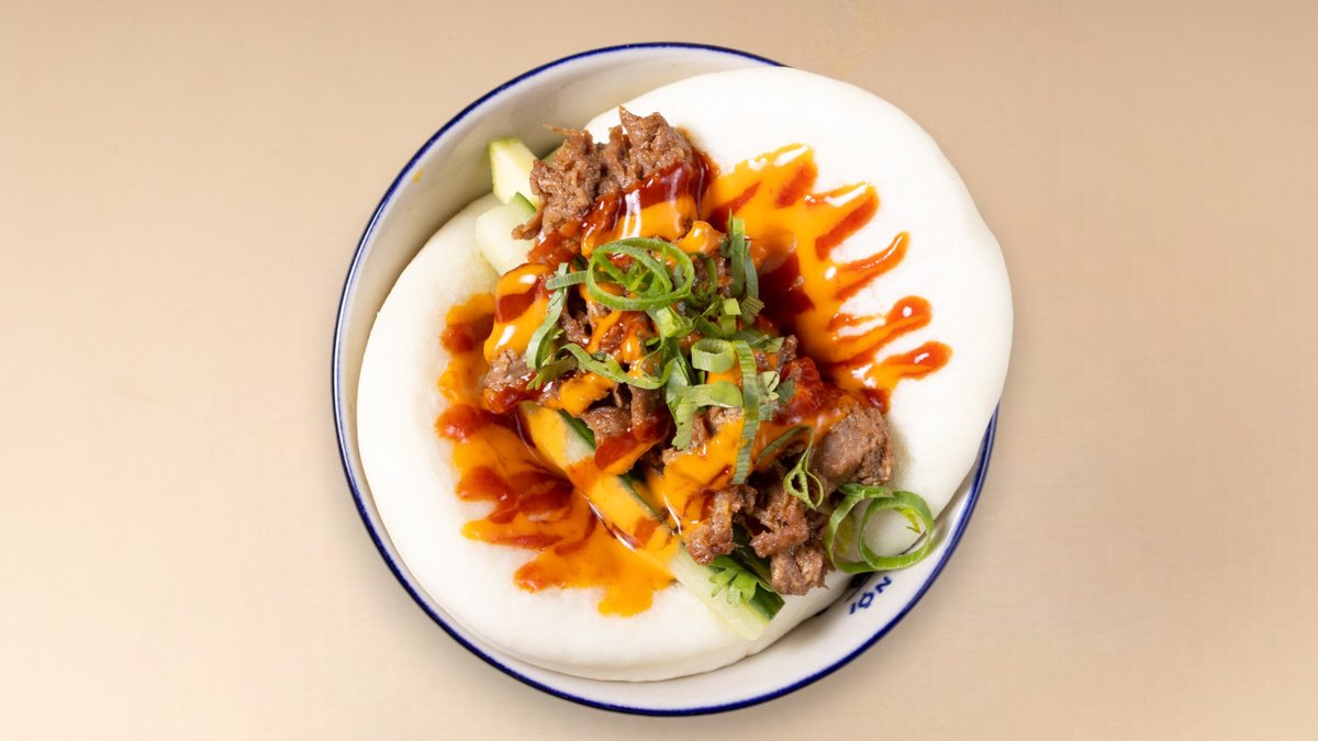 1 gedämpftes Bun mit Pulled Sojastreifen in Hoisin Sauce, Chili Mayonnaise, Mango, Gurke, Koriander und Lauch