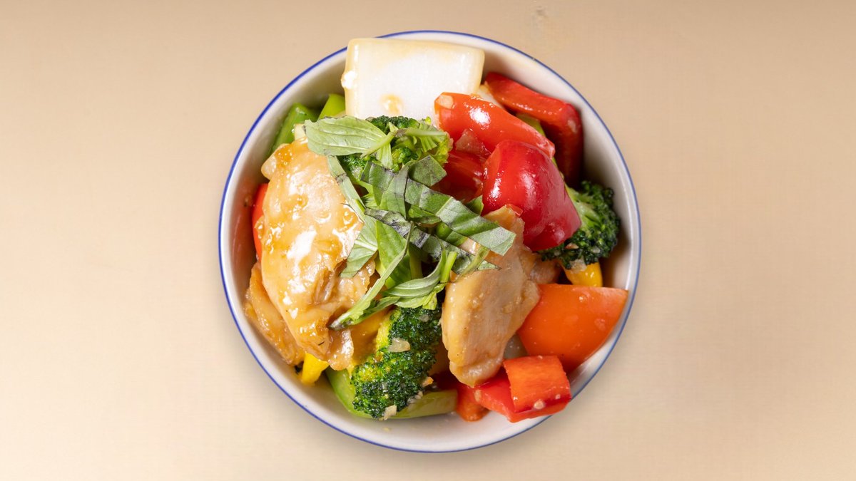 Sojastreifen mit dunkler Austernpilz-Soße im Wok geschwenkt, frischer Brokkoli, Paprika Mix und Zwiebeln, frischer Basilikum