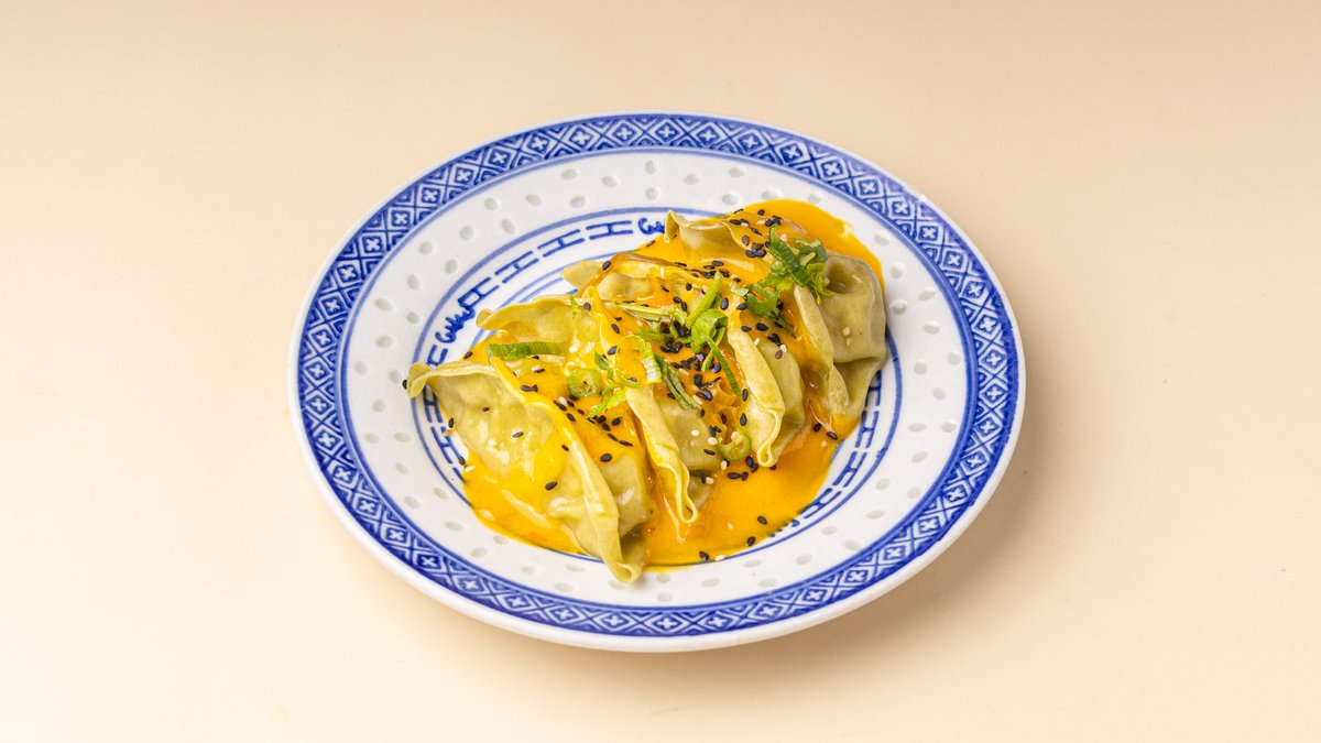 4 Stück hausgemachte Teigtaschen mit einer Spinatfüllung, Knoblauch, Erbsen, Sojabohnen, Sesam, Koriander und Lauchzwiebeln überzogen von einer Mango-Currysoße