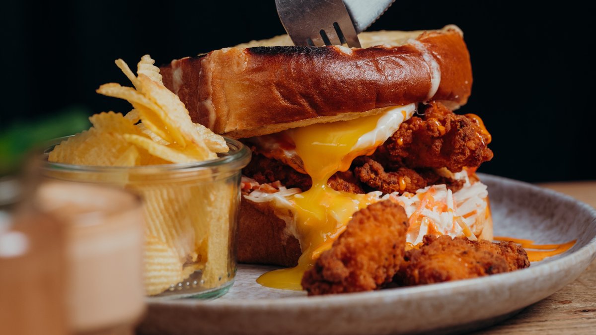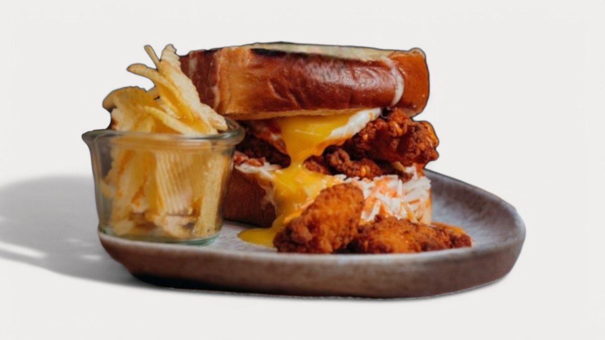 mit Milchbrot, Crispy Chicken Tenderes, geschmolzenem Käse, Kohlsalat, Eier und Crispies