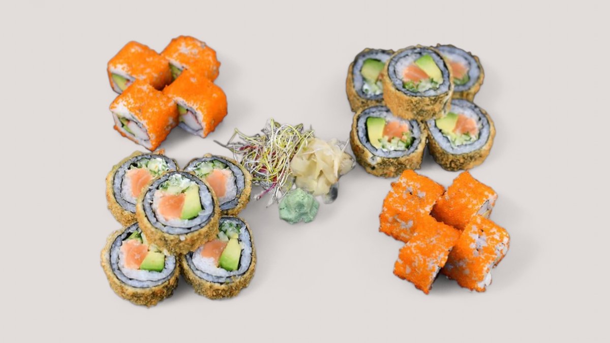8x Sake Avocado Inside-Out 18x Maki (Avocado, Sake, Tekka) 6x Nigiri (Maguro, Sake) 10x Toronto Roll