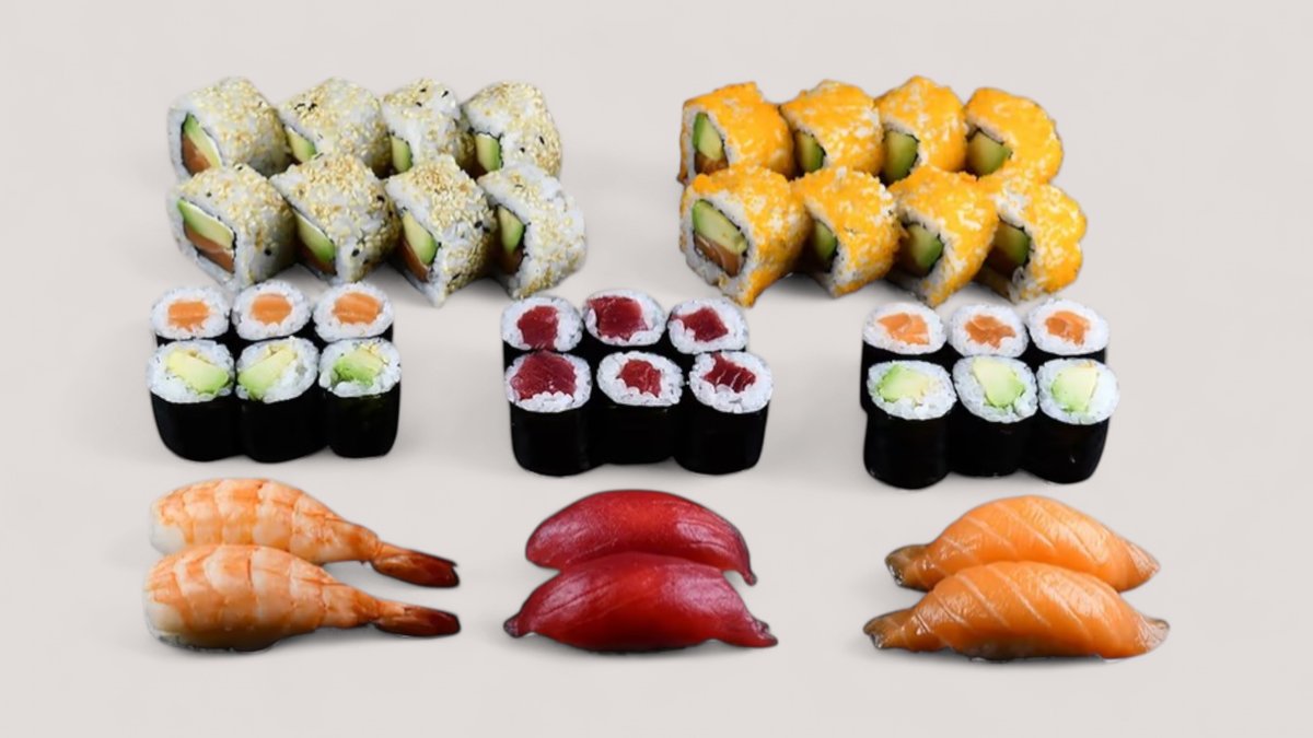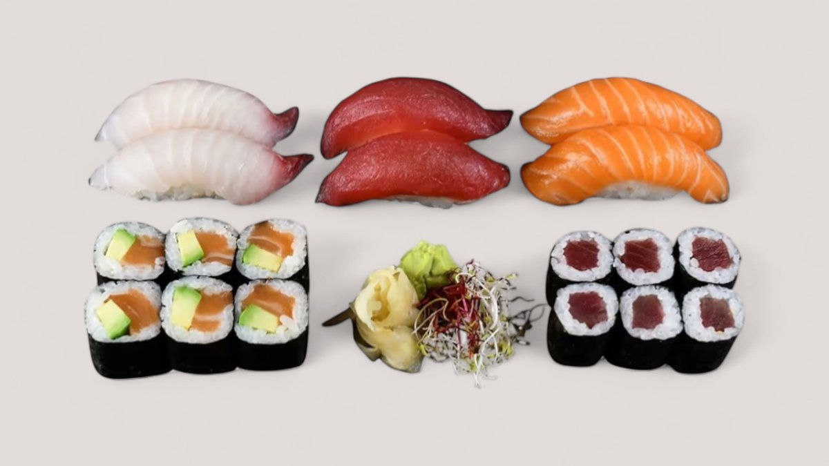6x Nigiri (Sake, Maguro, Ebi) 18x Maki (Sake, Tekka, Avocado) 8x Sake Avocado Inside-Out 8x Philadelphia Roll Inside-Out