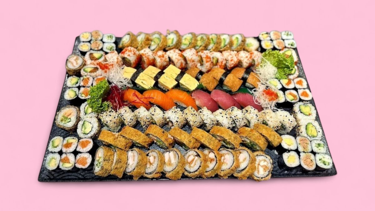 36x Maki (6 Lachs, 6 Lachs Avo, 6 Spicy Tuna Gek, 6 Avocado, 6 Kappa, 6 Tamago) 12x Nigiri (3 Lachs, 3 Tamago, 3 Maguro, 3 Inari) 20x Crunchy Rolls (10 Avocado, 10 Chicken) 32x Inside Out (8 California, 8 Lachs, 8 Tori, 8 Avocado) 10x Toronto Rolls