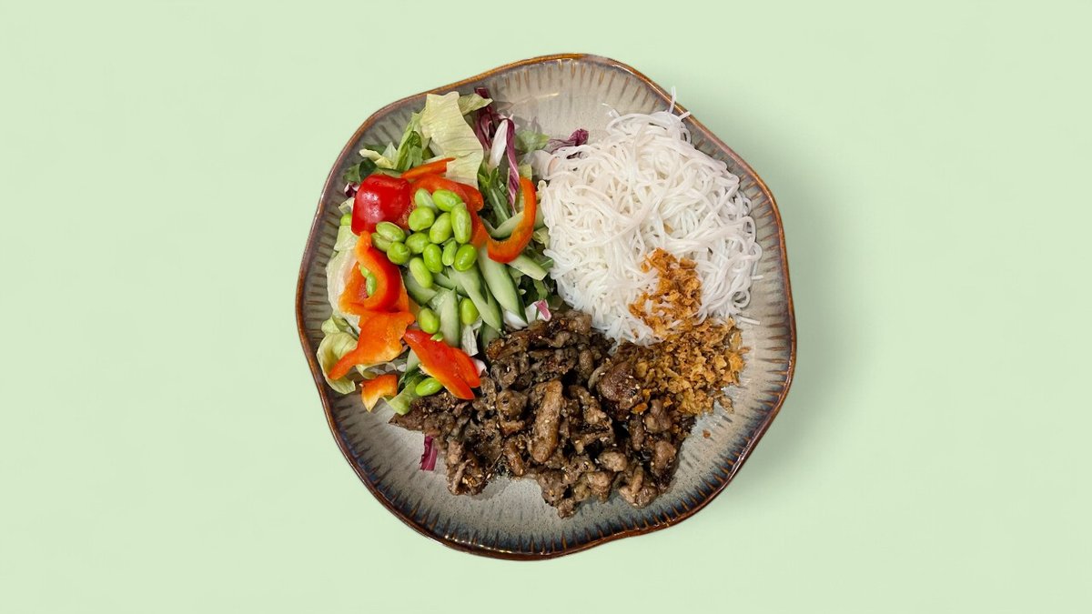 mit gegrilltem Schweinefleisch, Reisnudeln und Chili-Limetten-Dressing