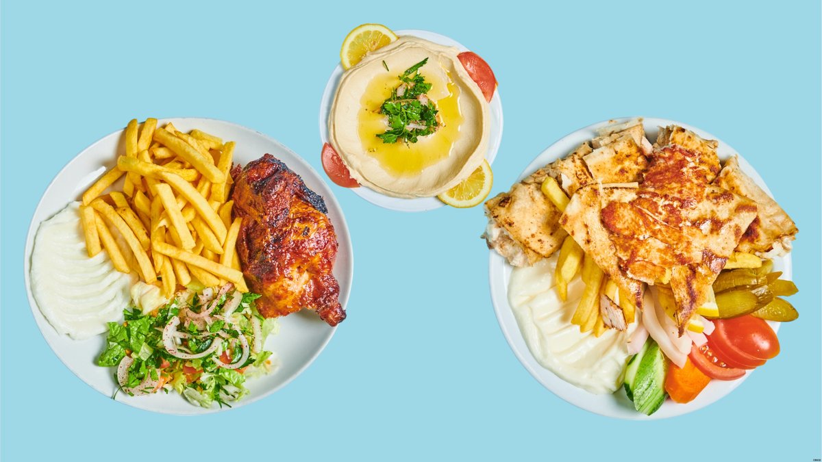 alle Gerichte werden mit Hähnchen zubereitet und mit Knoblauch, Salat, Pommes frites und hausgemachtem Muhamara-Brot serviert
