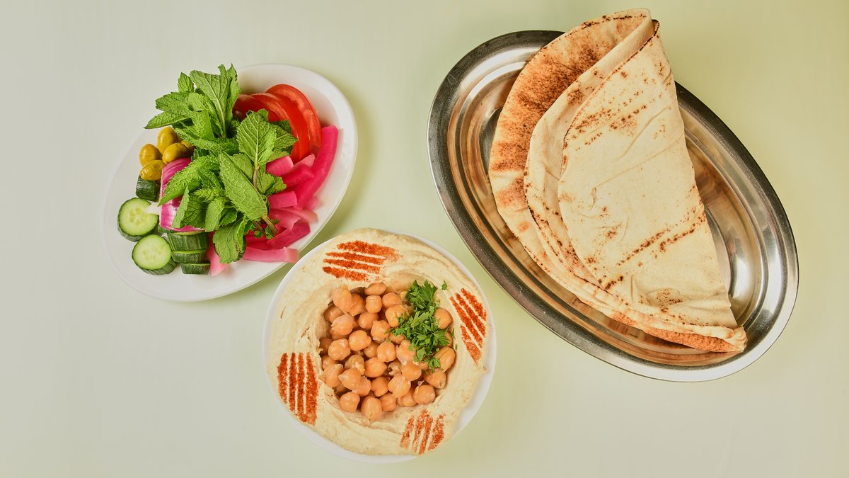 mit Hummus, Gemüse, Fladenbrot und Tahini