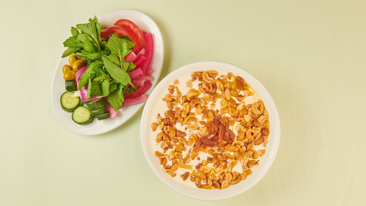 mit Kichererbsen, gebratenem Brot, Joghurt, Tahini, Cashewkernen und Butter