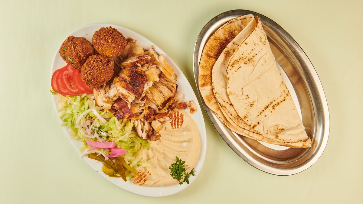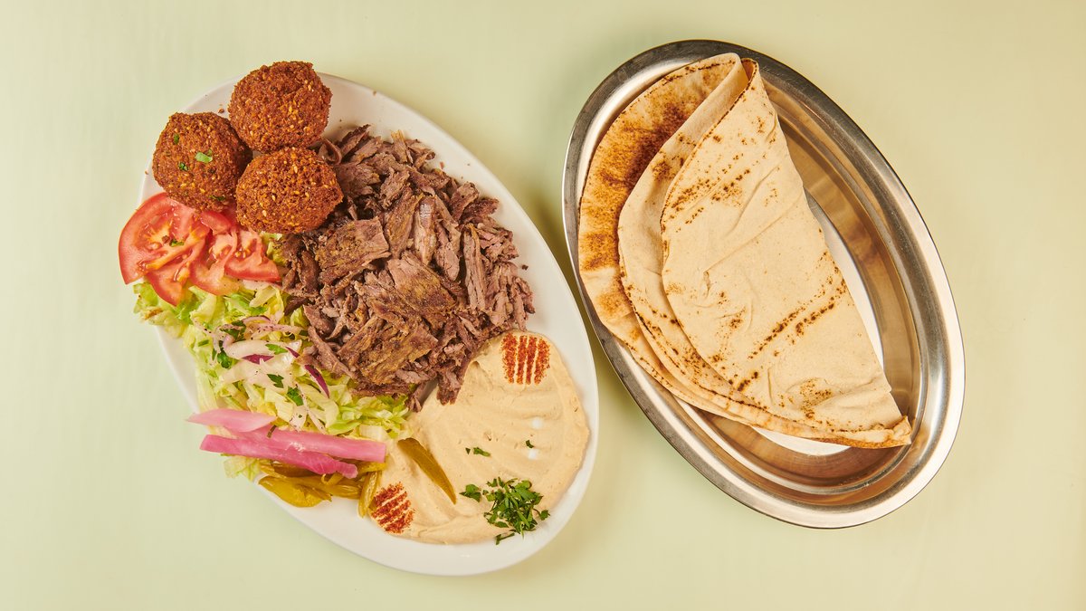 mit Rind- und Hähnchenschawarma, Falafel, Halloumi, Makal, Mutabbal und Sesamsoße