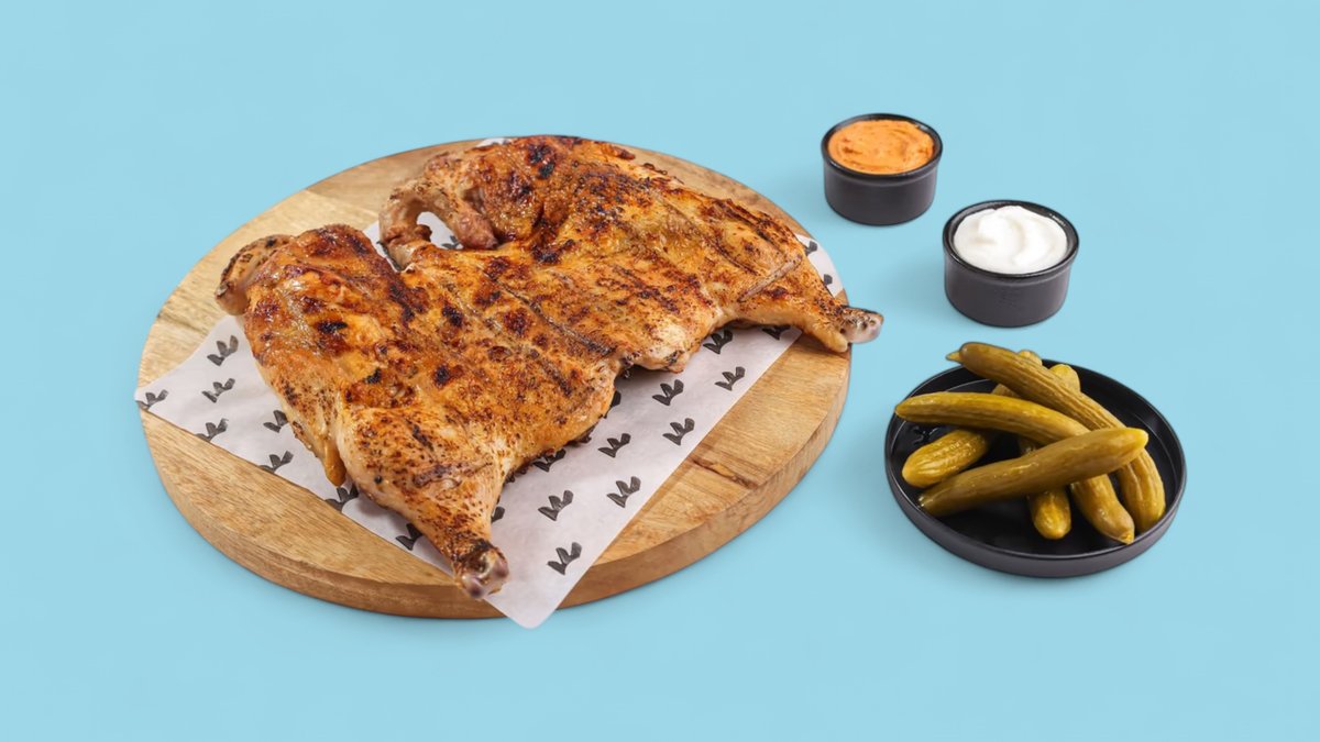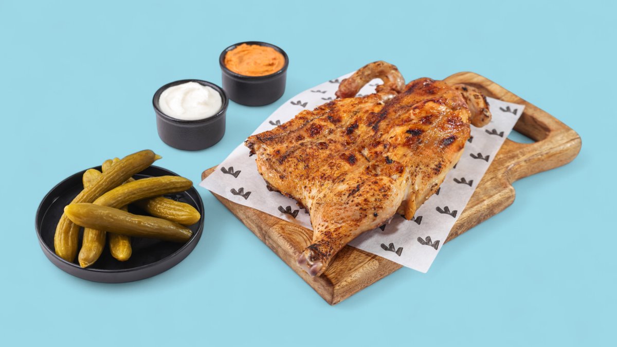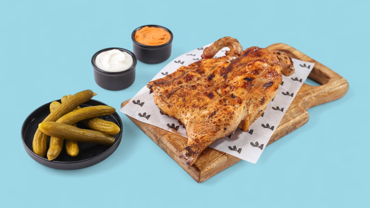 Halbes gegrilltes hähnchen - brust serviert mit knoblauch box(2pcs),chilli soße(1 pcs) sauer gurken box , brot