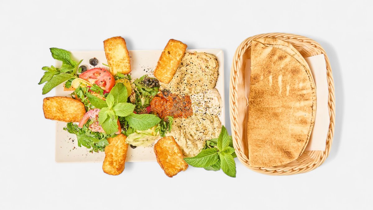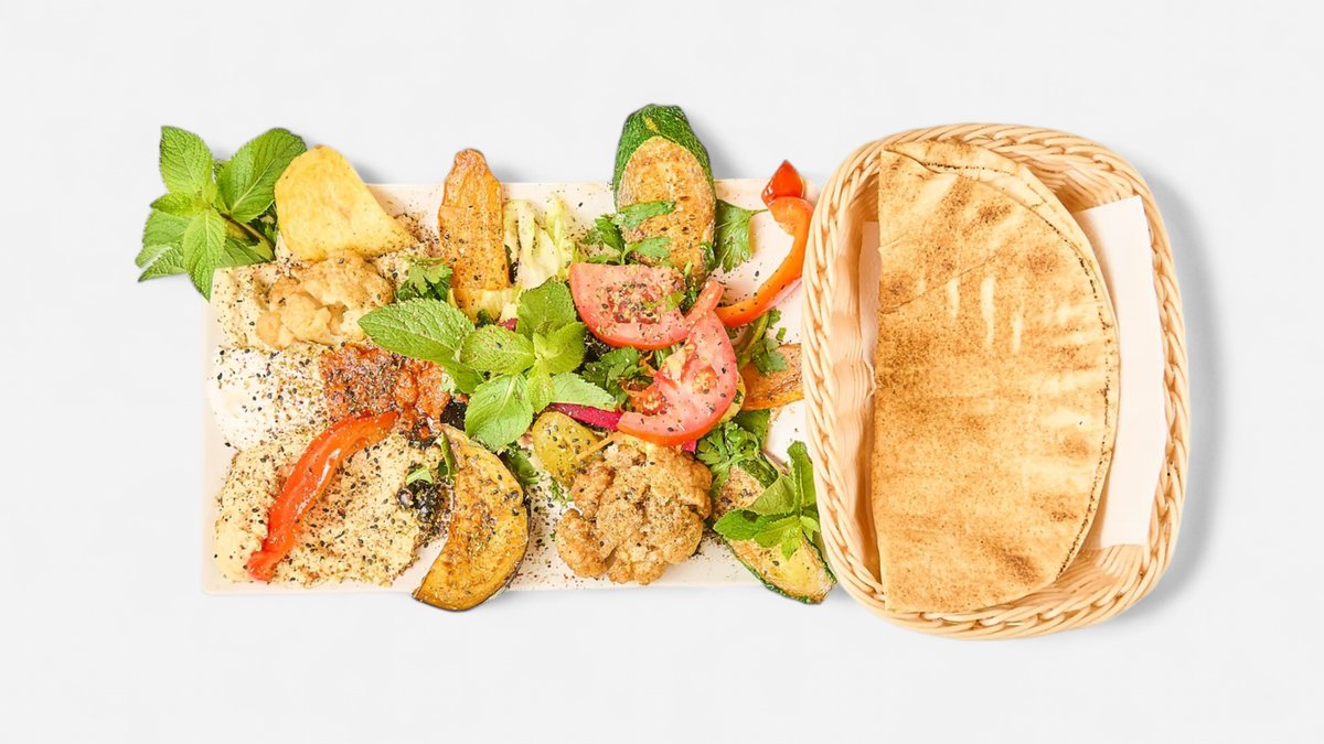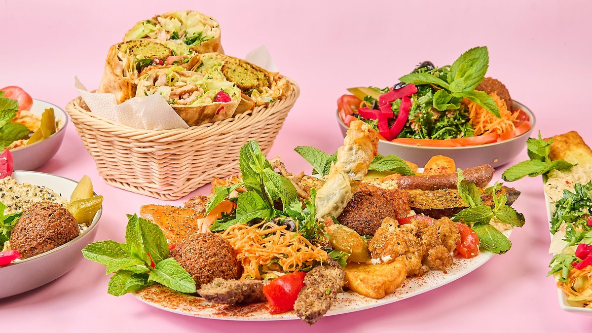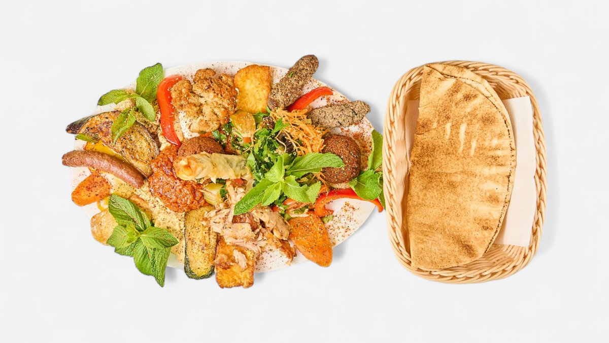 mit Falafel, Halloumi, Makali, Merguez, Kafta, Shish Taouk und Spinat-Feta-Taschen