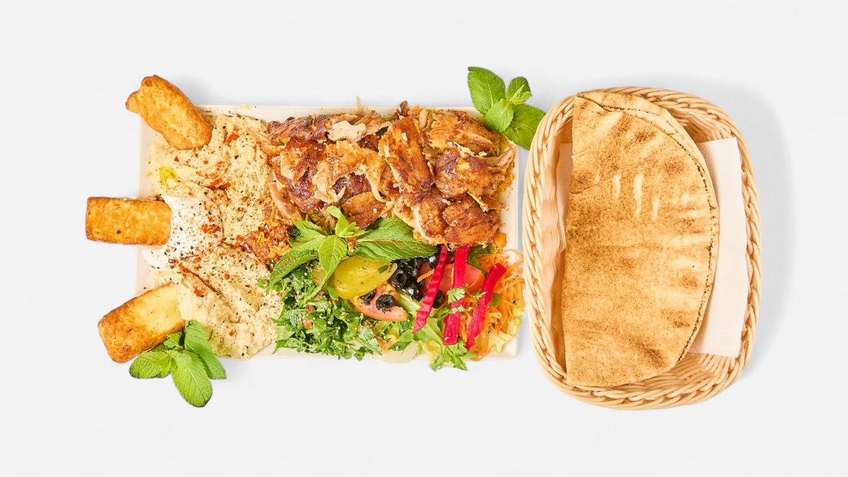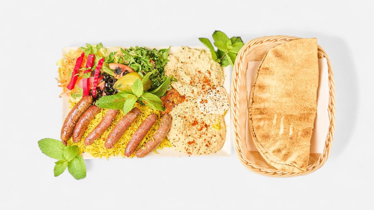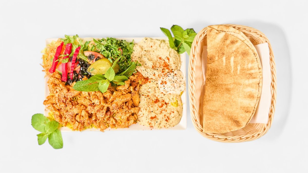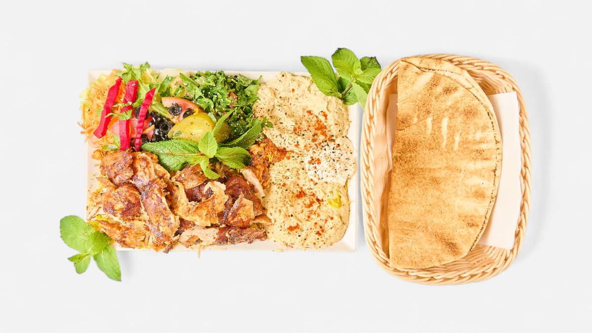 alle Teller werden mit Hummus, Salat, Tabbouleh, Brot, Mangosoße, Knoblauchsoße, scharfer Soße und in einer Größe deiner Wahl serviert