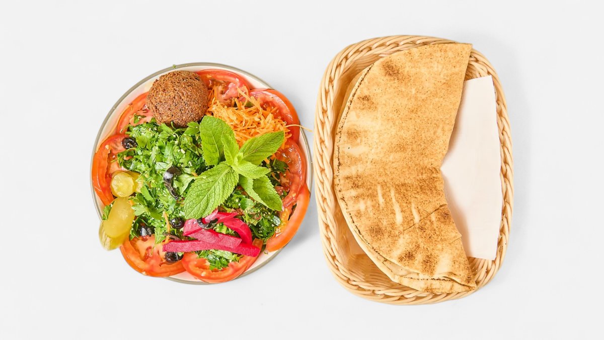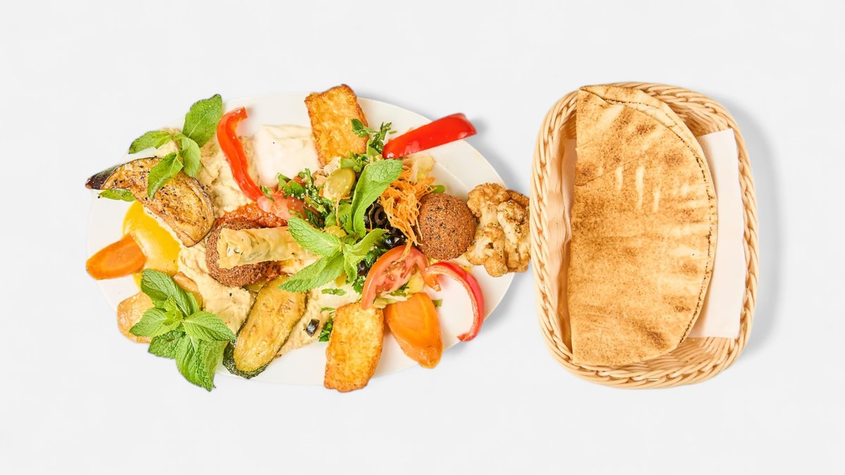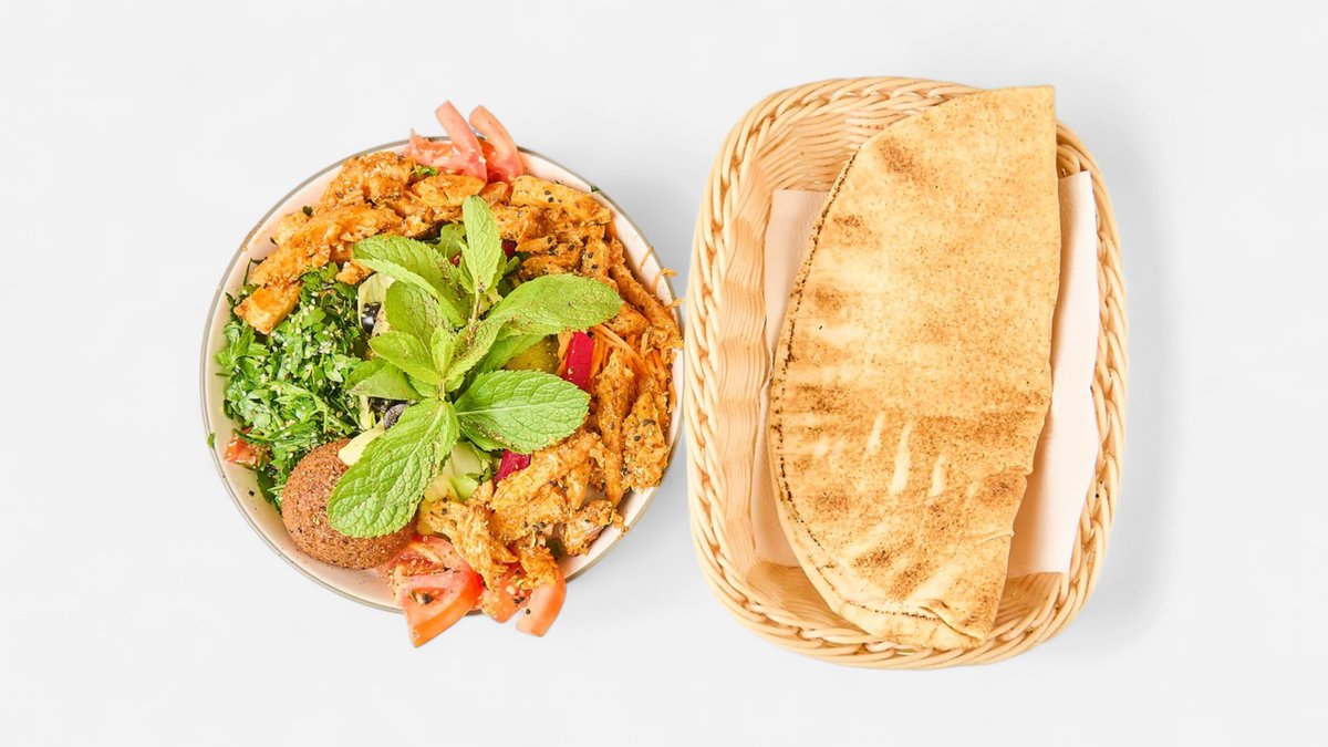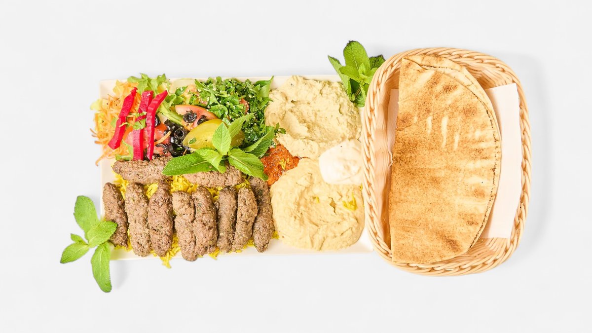 alle Teller werden mit Hummus, Salat, Tabbouleh, Brot, Mangosoße, Knoblauchsoße, scharfer Soße und in einer Größe deiner Wahl serviert