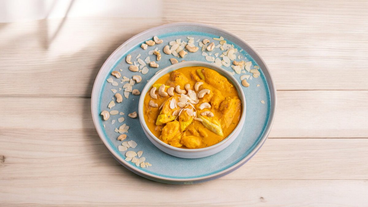 Hähnchenbrustfilet in einer cremigen Soße aus Mandeln, Cashewnüssen und orientalischen Gewürzen, verfeinert mit geriebenem Rahmkäse