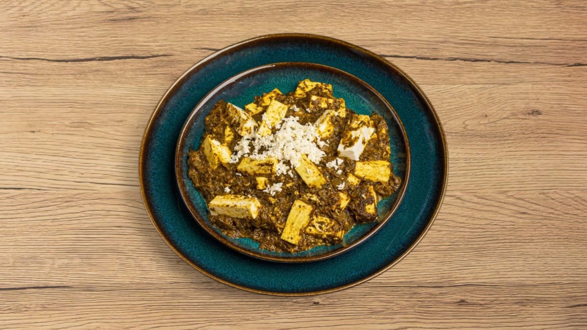 leicht scharf hausgemachter gebratener Paneer mit saftig grünem Spinat, Zwiebeln und einzigartigen Gewürzen - Das "Most Wanted" vegetarisches Gericht