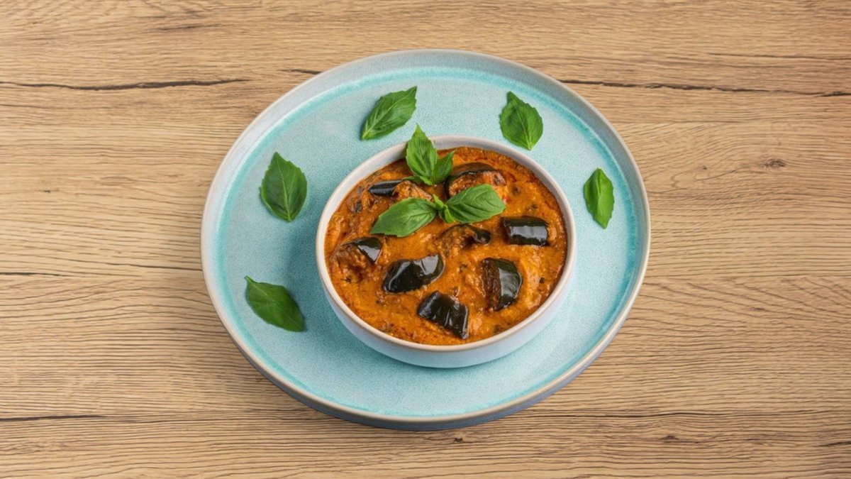 Auberginen-Stückchen gebraten in einer Masala-Gewürzmischung mit frischem Basilikum, abgerundet mit Kokosmilch