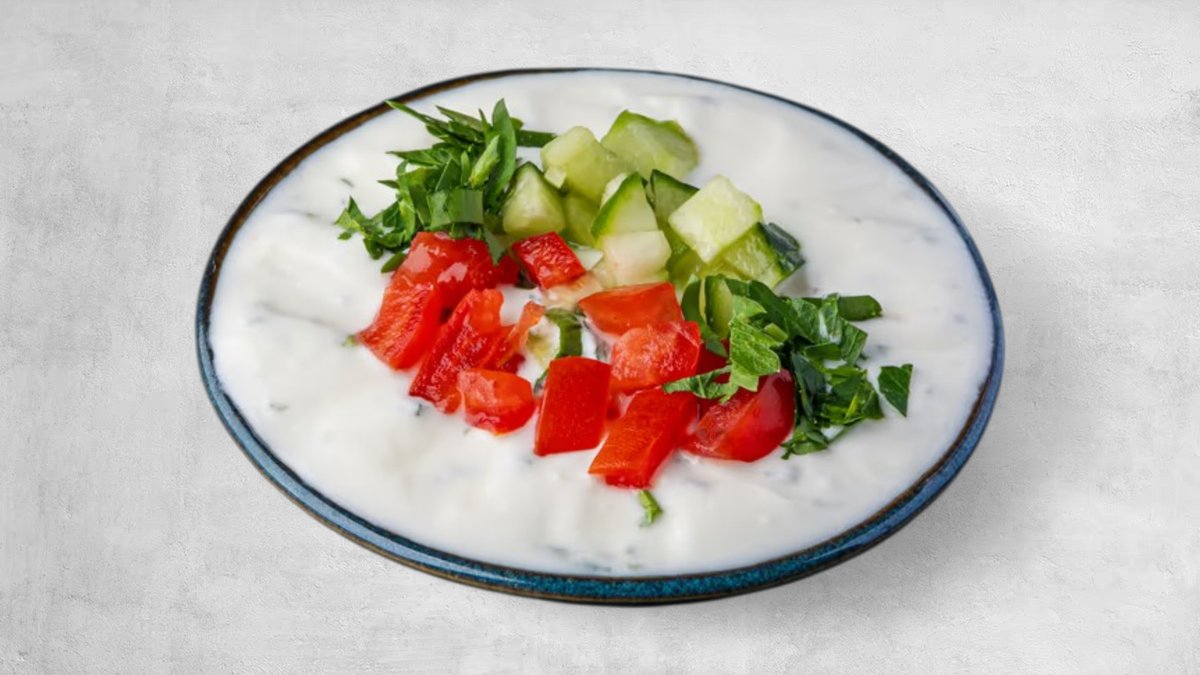 typischer indischer Joghurt-Dip mit frischen Gewürzen, Tomaten und Gurken