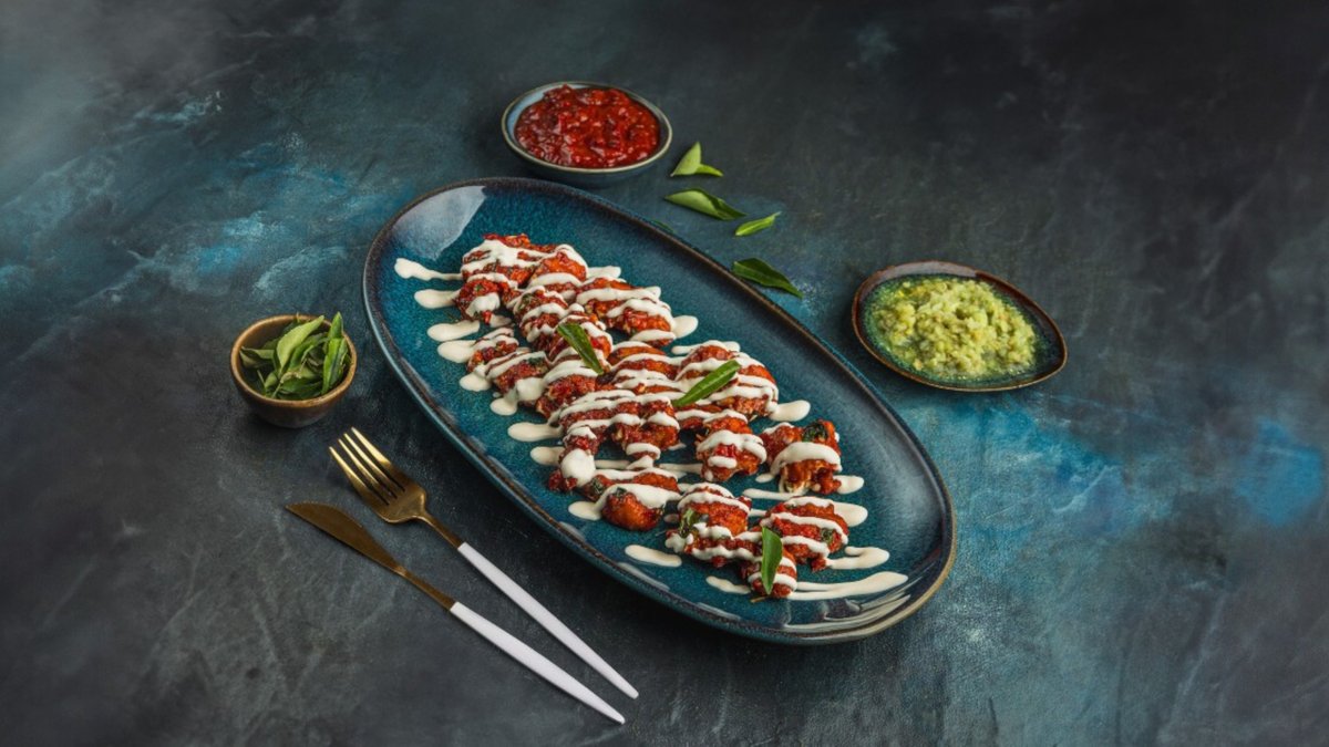 eine südindische Kreation, bei der Hähnchenbrustfilet frittiert und dann mit Curryblättern und verschiedenen Gewürzen angebraten wird, nach einer exotischen Geheimrezeptur