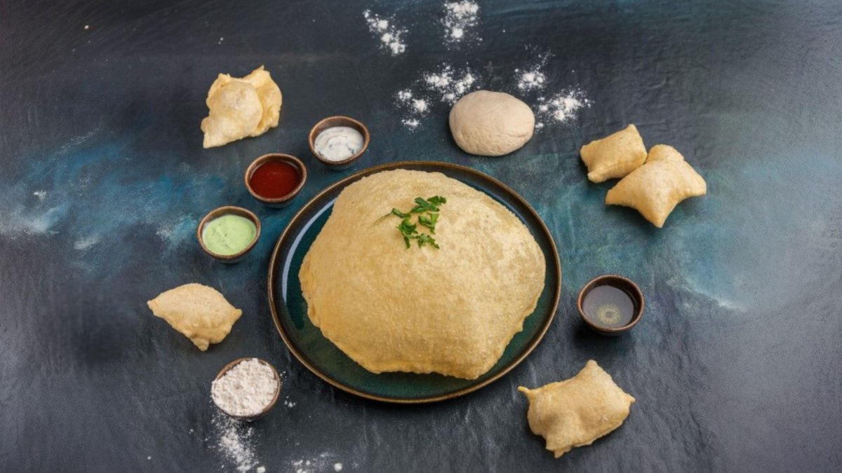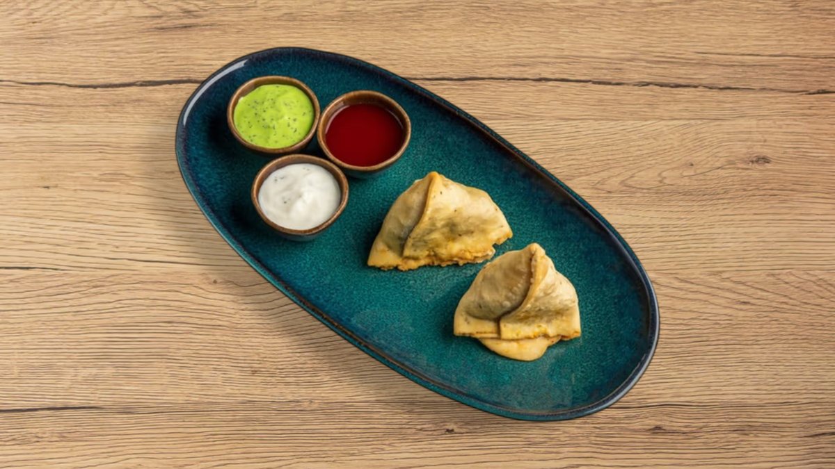 2 Stück, leicht scharf Gemüse-Teigtaschen gefüllt mit Kartoffeln, Erbsen, Rosinen und Mandeln, dazu Soße deiner Wahl