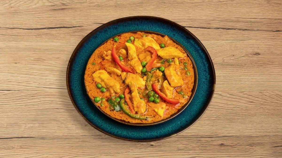 leicht scharf zartes Hähnchenbrustfilet gebraten mit einer einzigartigen Gewürzmischung aus Mumbai, verfeinert mit Kokosnuss, Paprika und Erbsen
