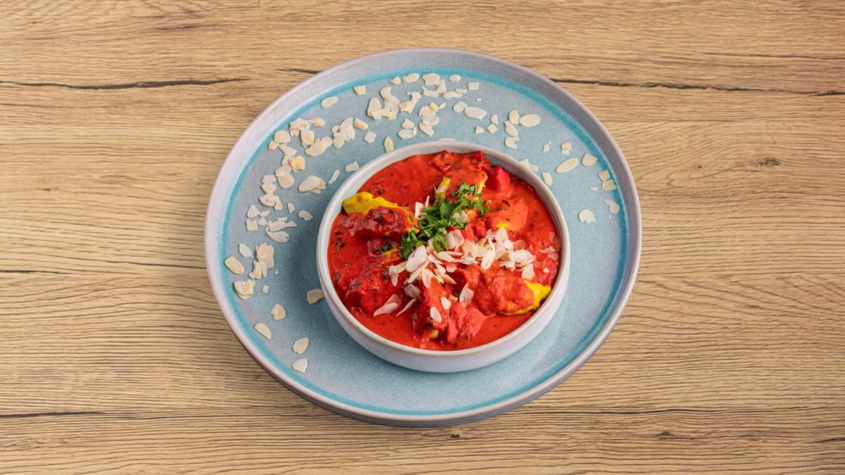 saftige Tandoori-Hähnchenstücke mit leckeren Gewürzen und Nüssen in einer cremigen Tomatensoße