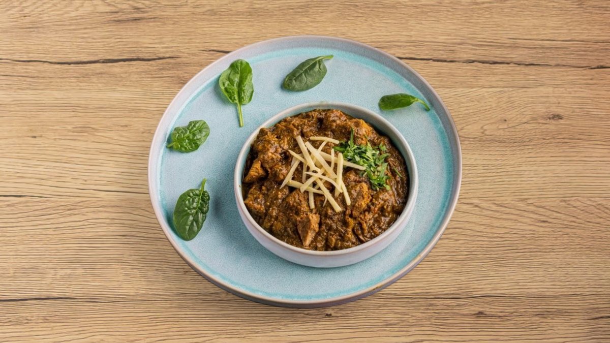 Planted - Beef - Bites als "Vegan Lamb", kräftig angebraten und in einer intensiv eingekochten Bhuna - Masala aus Zwiebeln, Tomaten, Ingwer und Gewürzen