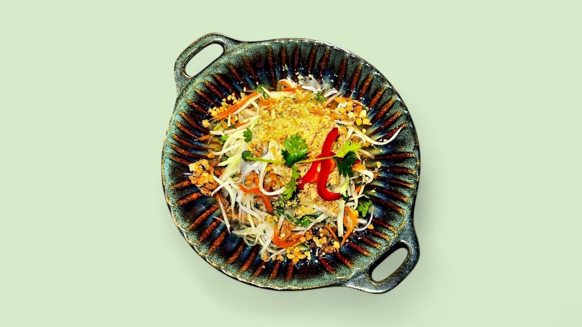 mit Papaya-Salat, Karotten, Erdnüssen, Koriander und scharfem Chili