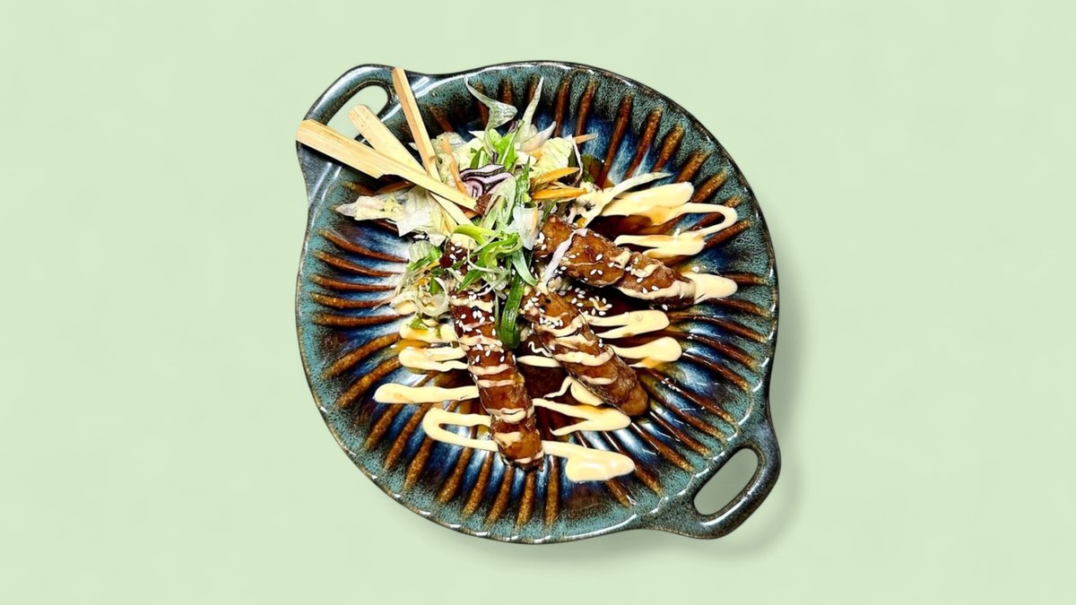 mit Spargel-Tempura, Lachs, Avocado, Philly-Käse, Teriyaki-Soße und Sesam