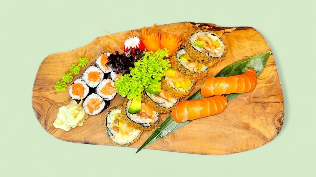 mit Lachs, Avocado, Oshinko, Kimchi, Frischkäse und Teriyaki-Soße