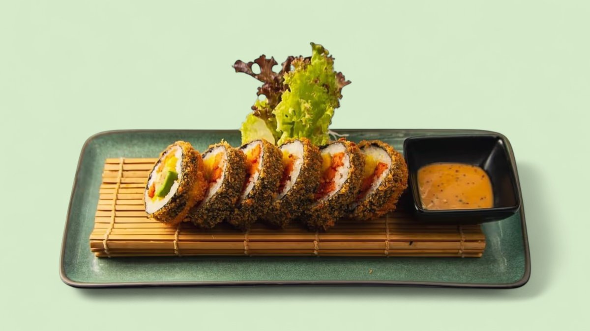mit Lachs-Tempura, Avocado, süßer Chilisoße und Mayonnaise