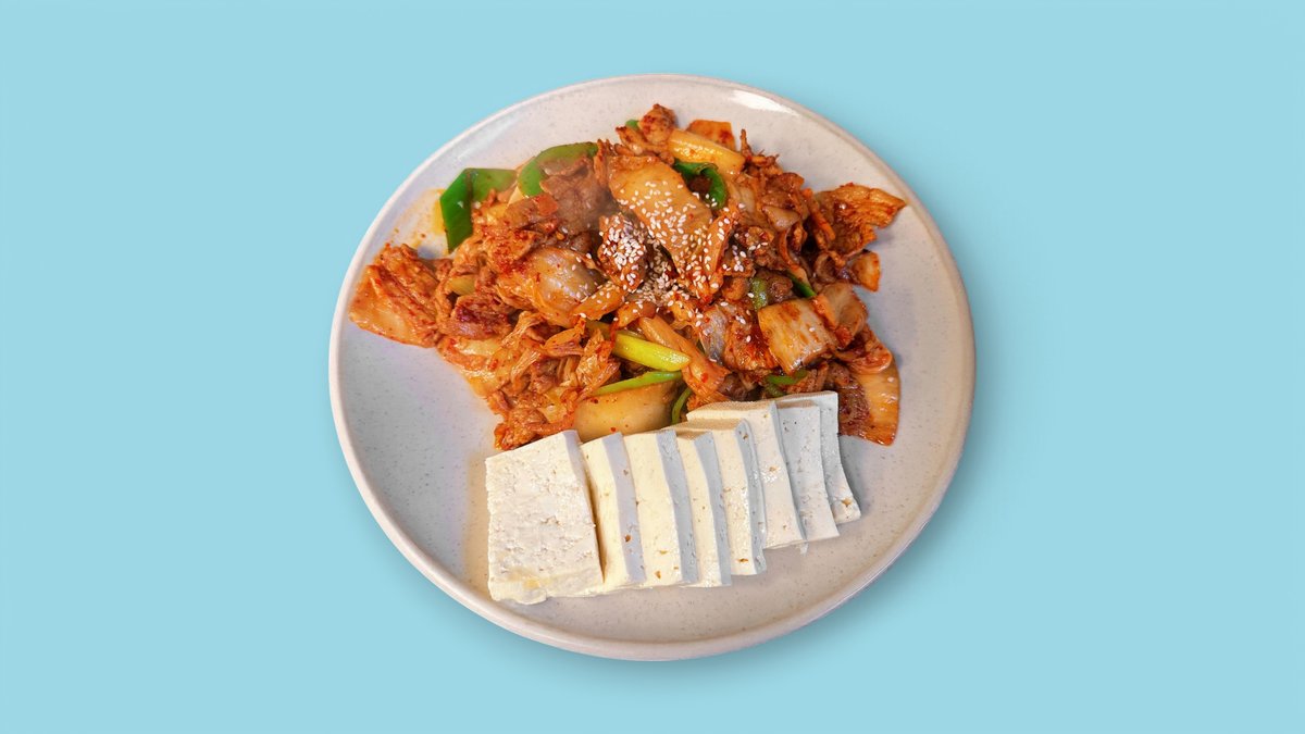 leicht scharf gebratenes Schweinefleisch mit Kimchi und Tofu