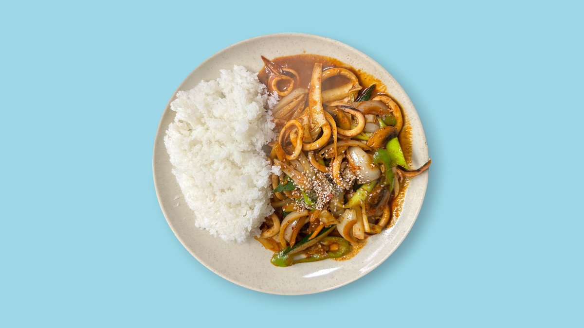 scharf gebratener Tintenfisch und GemĂĽse auf Reis