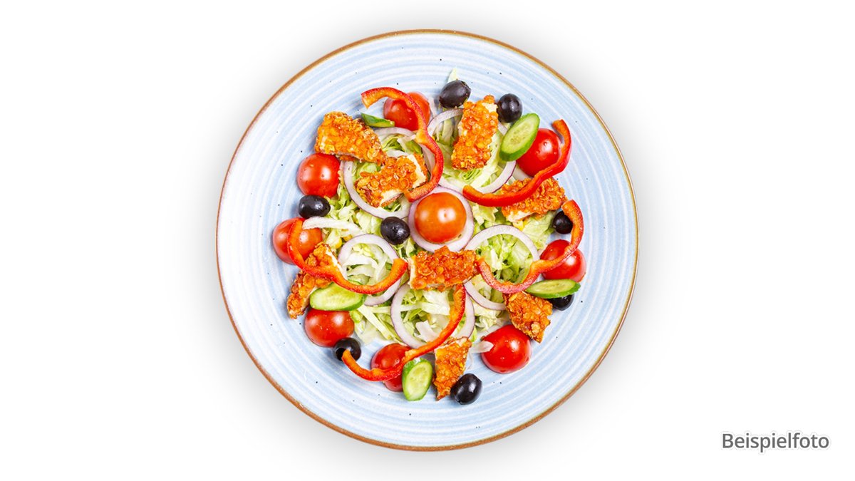 alle Salate werden mit Eisbergsalat, Kirschtomaten, Gurken und roten Zwiebeln zubereitet